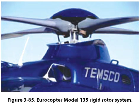 With a rigid rotor system, the blades are not hinged for movement up and down (flapping) or for movement fore and aft (drag). The blades are able to move around the pitch change axis, with each blade being able to independently change its blade angle. The rigid rotor system uses blades that are very strong and yet flexible. They are flexible enough to bend when they need to, without the use of hinges or a teetering rotor, to compensate for the uneven lift that occurs in forward flight. The Eurocopter model 135 uses a rigid rotor system. [Figure 3-85]