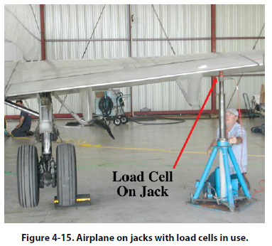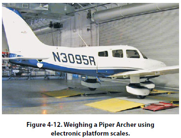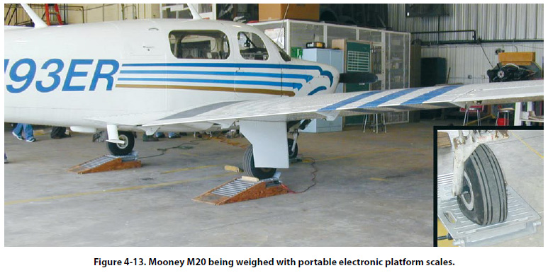 In Figure 4-13, a Mooney M20 airplane is being weighed with portable electronic platform scales.