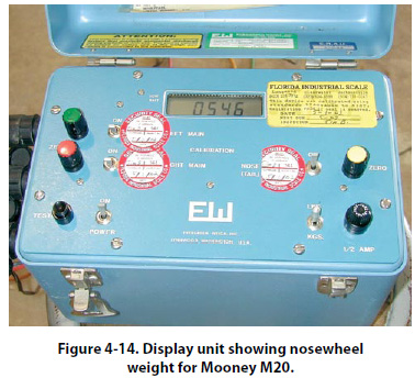 Notice in the picture of the Mooney that its nose tire is deflated (close-up shown in the lower right corner of the photo). This was done to get the airplane in a level flight attitude. This type of scale is easy to transport and can be powered by household current or by a battery contained in the display unit. The display unit for these scales is shown in Figure 4-14.