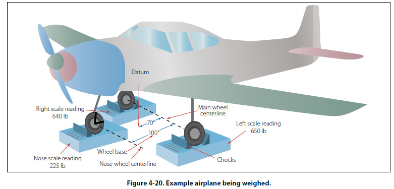 Example Weighing of an Airplane In Figure 4-20, a tricycle gear airplane is being weighed by using three floor scales.