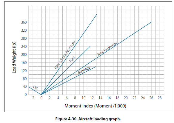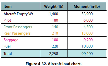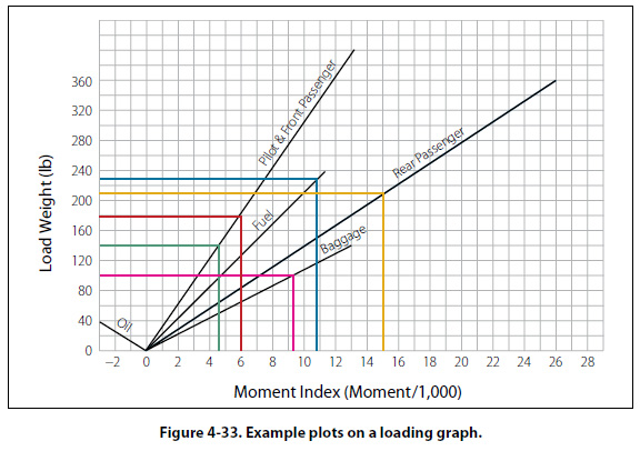 An example of loading the airplane for flight and calculating the total loaded weight and the total loaded moment is shown in Figures 4-32 and 4-33. The use of the loading graph to determine the moment for each of the useful load items is shown in Figure 4-33. The color used for each useful load item in Figure 4-32 matches the color used for the plot on the loading graph.