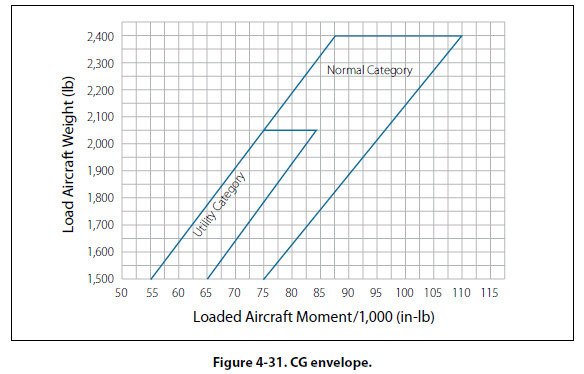 The loading graph illustrated in Figure 4-30 is used to determine the index number (moment value) of any item or weight that may be involved in loading the aircraft. To use this graph, find the point on the vertical scale that represents the known weight. Project a horizontal line to the point where it intersects the proper diagonal weight line (i.e., pilot, copilot, baggage). Where the horizontal line intersects the diagonal, project a vertical line downward to determine the loaded moment (index number) for the weight being added. After the moment for each item of weight has been determined, all weights are added and all moments are added. The total weight and moment is then plotted on the CG envelope. [Figure 4-31] The total weight is plotted on the vertical scale of the graph, with a horizontal line projected out from that point. The total moment is plotted on the horizontal scale of the graph, with a vertical line projected up from that point. Where the horizontal and vertical plot lines intersect on the graph is the center of gravity for the loaded aircraft. If the point where the plot lines intersect falls inside the CG envelope, the aircraft CG is within limits. In Figure 4-31, there are actually two CG envelopes, one for the aircraft in the Normal Category and one for the aircraft in the Utility Category. The loading graph and CG envelope shown in Figures 4-30 and 4-31 are for an airplane with the following specifications and weight and balance data.