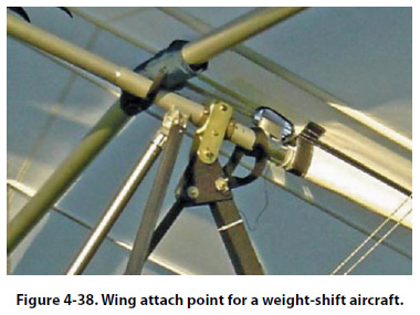 The wing attach point, with respect to the wing keel, is an adjustable location. The attach point can be loosened and moved slightly forward or slightly aft, depending on the weight of the occupants. For example, if the aircraft is flown by a heavy person, the attach point can be moved a little farther aft, bringing the wing forward, to compensate for the change in center of gravity. Figure 4-38 shows a close-up of the wing attach point, and the small amount of forward and aft movement that is available.