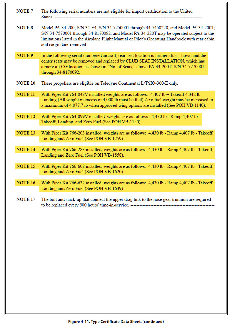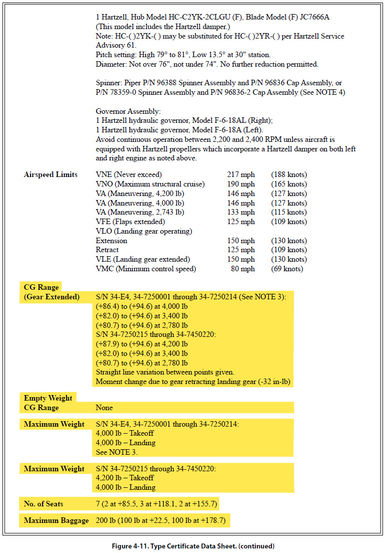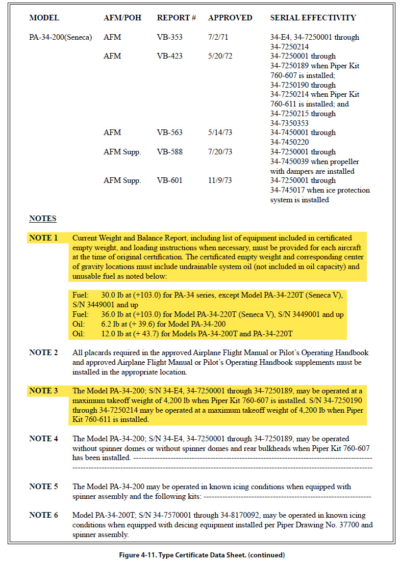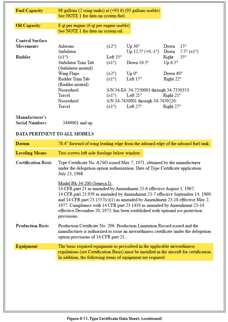 The document in Figure 4-11 is a Type Certificate Data Sheet (TCDS) for a Piper twin-engine airplane known as the Seneca (PA-34-200). The main headings for the information typically contained in a TCDS are included, but much of the information contained under these headings has been removed if it did not directly pertain to weight and balance. Information on only one model of Seneca is shown, because to show all the different models would make the document excessively long. The portion of the TCDS that has the most direct application to weight and balance is highlighted in yellow. Some of the important weight and balance information found in a Type Certificate Data Sheet is as follows: 1. Center of gravity range 2. Maximum weight 3. Leveling means 4. Number of seats and location 5. Baggage capacity 6. Fuel capacity 7. Datum location 8. Engine horsepower 9. Oil capacity 10. Amount of fuel in empty weight 11. Amount of oil in empty weight