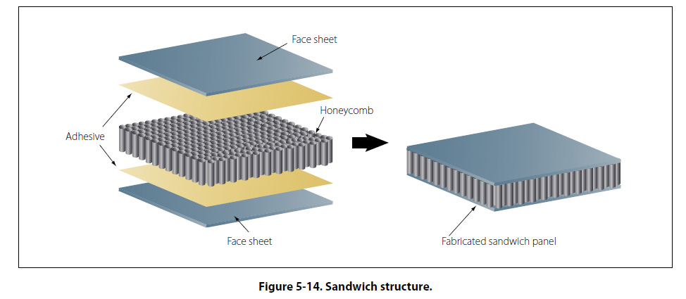 Laminated Structures Composites can be made with or without an inner core of material. Laminated structure with a core center is called a sandwich structure. Laminate construction is strong and stiff, but heavy. The sandwich laminate is equal in strength, and its weight is much less; less weight is very important to aerospace products. The core of a laminate can be made from nearly anything. The decision is normally based on use, strength, and fabricating methods to be used. Various types of cores for laminated structures include rigid foam, wood, metal, or the aerospace preference of honeycomb made from paper, Nomex, carbon, fiberglass or metal. Figure 5-14 shows a typical sandwich structure.