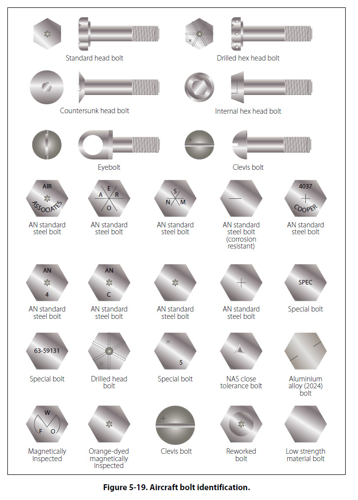 Aircraft Bolts Aircraft bolts are fabricated from cadmium- or zincplated corrosion resistant steel, unplated corrosion resistant steel, or anodized aluminum alloys. Most bolts used in aircraft structures are either general purpose, AN bolts, or NAS internal wrenching or close tolerance bolts, or MS bolts. In certain cases, aircraft manufacturers make bolts of different dimensions or greater strength than the standard types. Such bolts are made for a particular application, and it is of extreme importance to use like bolts in replacement. Special bolts are usually identified by the letter “S" stamped on the head. AN bolts come in three head styles—hex head, clevis, and eyebolt. [Figure 5-19] NAS bolts are available in hex head, internal wrenching, and countersunk head styles.