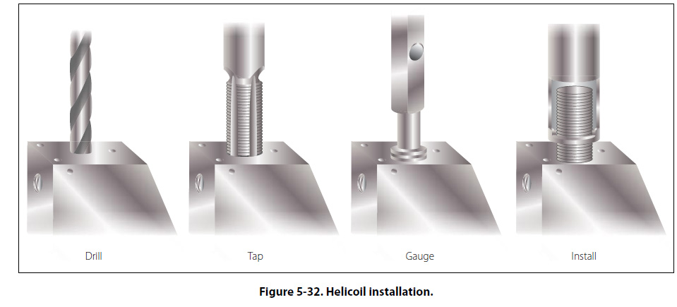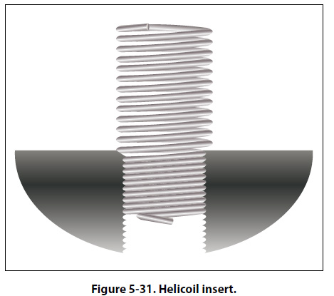 [Figure 5-31] They form unified coarse or unified fine thread classes 2-band 3B when assembled into (helicoil) threaded holes. The assembled insert accommodates UNJ (controlled radius root) male threaded members. Each insert has a driving tang with a notch to facilitate removal of the tang after the insert is screwed into a helicoil tapped hole. They are used as screw thread bushings. In addition to being used to restore damaged threads, they are used in the original design of missiles, aircraft engines, and all types of mechanical equipment and accessories to protect and strengthen tapped threads in light materials, metals, and plastics, particularly in locations which require frequent assembly and disassembly, and/or where a screw locking action is desired.
