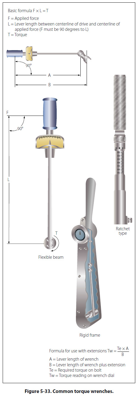 [Figure 5-33] When using the flexible beam and the rigid frame torque wrenches, the torque value is read visually on a dial or scale mounted on the handle of the wrench. To use the ratchet type, unlock the grip and adjust the handle to the desired setting on the micrometer type scale, then relock the grip. Install the required socket or adapter to the square drive of the handle. Place the wrench assembly on the nut or bolt and pull the wrench assembly on the nut or bolt and pull in a clockwise direction with a smooth, steady motion. (A fast or jerky motion will result in an improperly torqued unit.) When the applied torque reaches the torque value indicated on the handle setting, the handle will automatically release or “break" and move freely for a short distance. The release and free travel is easily felt, so there is no doubt about when the torquing process is completed. To assure getting the correct amount of torque on the fasteners, all torque wrenches must be tested at least once a month or more often if necessary. Note: It is not advisable to use a handle length extension on a flexible beam type torque wrench at any time. A handle extension alone has no effect on the reading of the other types. The use of a drive end extension on any type of torque wrench makes the use of the formula mandatory. When applying the formula, force must be applied to the handle of the torque wrench at the point from which the measurements were taken. If this is not done, the torque obtained will be incorrect. Torque Tables. Use the standard torque table as a guide in tightening nuts, studs, bolts, and screws whenever specific torque values are not called out in maintenance procedures. The following rules apply for correct use of the torque table: [Figure 5-34]