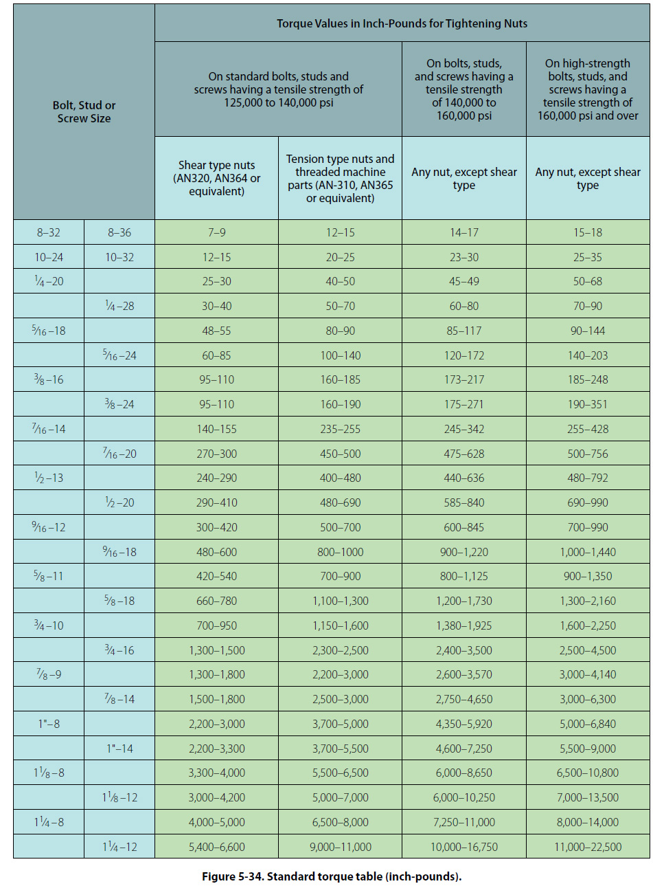 1. To obtain values in foot-pounds, divide inchpounds by 12. 2. Do not lubricate nuts or bolts except for corrosionresistant steel parts or where specifically instructed to do so. 3. Always tighten by rotating the nut first if possible. When space considerations make it necessary to tighten by rotating the bolt head, approach the high side of the indicated torque range. Do not exceed the maximum allowable torque value. 4. Maximum torque ranges should be used only when materials and surfaces being joined are of sufficient thickness, area, and strength to resist breaking, warping, or other damage. 5. For corrosion resisting steel nuts, use torque values given for shear type nuts. 6. The use of any type of drive end extension on a torque wrench changes the dial reading required to obtain the actual values indicated in the standard torque range tables. When using a drive end extension, the torque wrench reading must be computed by use of the proper formula, which is included in the handbook accompanying the torque wrench. Cotter Pin Hole Line Up When tightening castellated nuts on bolts, the cotter pin holes may not line up with the slots in the nuts for the range of recommended values. Except in cases of highly stressed engine parts, the nut may not be over torque. Remove hardware and realign the holes. The torque loads specified may be used for all unlubricated cadmium-plated steel nuts of the fine or coarse thread series which have approximately equal number of threads and equal face bearing areas. These values do not apply where special torque requirements are specified in the maintenance manual. If the head end, rather than the nut, must be turned in the tightening operation, maximum torque values may be increased by an amount equal to shank friction, provided the latter is first measured by a torque wrench. |