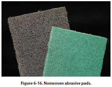 Mechanical Removal of Iron Rust The most practicable means of controlling the corrosion of steel is the complete removal of corrosion products by mechanical means and restoring corrosion preventive coatings. Except on highly stressedsteel surfaces, the use of abrasive papers and compounds, small power buffers and buffing compounds, hand wire brushing, or steel wool are all acceptable cleanup procedures. However, it should be recognized that in any such use of abrasives, residual rust usually remains in the bottom of small pits and other crevices. It is practically impossible to remove all corrosion products by abrasive or polishing methods alone. As a result, once a part cleaned in such a manner has rusted, it usually corrodes again more easily than it did the first time. The introduction of variations of the nonwoven abrasive pad has also increased the options available for the removal of surface rust. [Figure 6-16] Flap wheels, pads intended for use with rotary or oscillating power tools, and hand-held nonwoven abrasive pads all can be used alone or with light oils to remove corrosion from ferrous components.