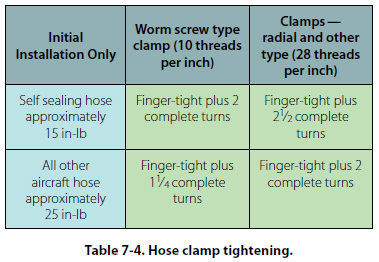 Clearance—The hose assembly must clear all other lines, equipment, and adjacent structure under every operating condition. Flexible hose should be installed so that it will be subject to a minimum of flexing during operation. Although hose must be supported at least every 24 inches, closer supports are desirable. Flexible hose must never be stretched tightly between two fittings. If clamps do not seal at specified tightening, examine hose connections and replace parts as necessary. The above is for initial installation and should not be used for loose clamps. For retightening loose hose clamps in service, proceed as follows: Non-self-sealing hose—if the clamp screw cannot be tightened with the fingers, do not disturb unless leakage is evident. If leakage is present, tighten one-fourth turn. Self-sealing hose—if looser than finger-tight, tighten to finger-tight and add one-fourth turn. [Table 7-4]