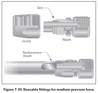 Size Designations Hose is also designated by a dash number, according to its size. The dash number is stenciled on the side of the hose and indicates the size tubing with which the hose is compatible. It does not denote inside or outside diameter. When the dash number of the hose corresponds with the dash number of the tubing, the proper size hose is being used. Dash numbers are shown in Figure 7-26. Hose Fittings Flexible hose may be equipped with either swaged fittings or detachable fittings, or they may be used with beads and hose clamps. Hoses equipped with swaged fittings are ordered by correct length from the manufacturer and ordinarily cannot be assembled by the mechanic. They are swaged and tested at the factory and are equipped with standard fittings. The detachable fittings used on flexible hoses may be detached and reused if they are not damaged; otherwise, new fittings must be used. [Figure 7-30]