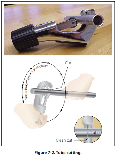 When cutting tubing, it is important to produce a square end, free of burrs. Tubing may be cut with a tube cutter or a hacksaw. The cutter can be used with any soft metal tubing, such as copper, aluminum, or aluminum alloy. Correct use of the tube cutter is shown in Figure 7-2. Special chipless cutters are available for cutting aluminum 6061-T6, corrosion resistant steel and titanium tubing.