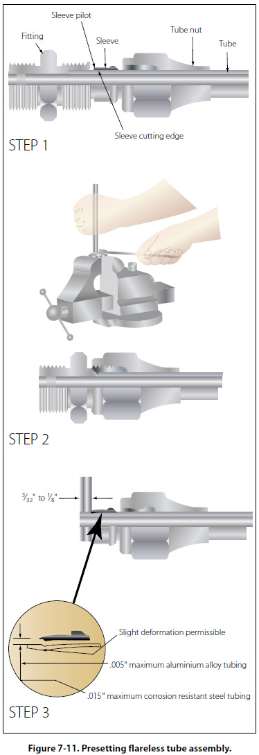 Fittings Rigid tubing may be joined to either an end item (such as a brake cylinder), another section of either rigid tubing, or to a flexible hose (such as a drain line). In the case of connection to an end item or another tube, fittings are required, which may or may not necessitate flaring of the tube. In the case of attachment to a hose, it may be necessary to bead the rigid tube so that a clamp can be used to hold the hose onto the tube. Flareless Fittings Although the use of flareless tube fittings eliminates all tube flaring, another operation, referred to as presetting, is necessary prior to installation of a new flareless tube assembly. Flareless tube assemblies should be preset with the proper size presetting tool or operation. Figure 7-11 (steps 1, 2, and 3) illustrates the presetting operation, which is performed as follows:
