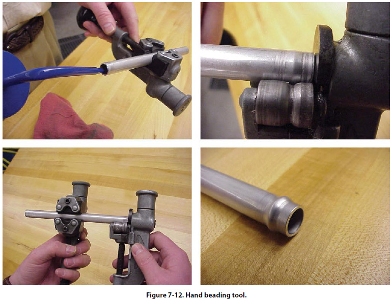 Cut the tube to the correct length, with the ends perfectly square. Deburr the inside and outside of the tube. Slip the nut, then the sleeve, over the tube (step 1), lubricate the threads of the fitting and nut with hydraulic fluid. Place the fitting in a vise (step 2), and hold the tubing firmly and squarely on the seat in the fitting. (The tube must bottom firmly in the fitting.) Tighten the nut until the cutting edge of the sleeve grips the tube. To determine this point, slowly turn the tube back and forth while tightening the nut. When the tube no longer turns, the nut is ready for tightening. Final tightening depends upon the tubing (step 3). For aluminum alloy tubing up to and including 1/2" outside diameter, tighten the nut from 1 to 11/6 turns. For steel tubing and aluminum alloy tubing over 1/2" outside diameter, tighten from 11/6 to 11/2 turns. After presetting the sleeve, disconnect the tubing from the fitting and check the following points: The tube should extend 3/32" to 1/8" beyond the sleeve pilot; otherwise, blowoff may occur. The sleeve pilot should contact the tube or have a maximum clearance of 0.005" for aluminum alloy tubing or 0.015" for steel tubing. A slight collapse of the tube at the sleeve cut is permissible. No movement of the sleeve pilot, except rotation, is permissible. Beading Tubing may be beaded with a hand beading tool, with machine beading rolls, or with grip dies. The method to be used depends on the diameter and wall thickness of the tube and the material from which it was made. The hand beading tool is used with tubing having 1/4" to 1" outside diameter. The bead is formed by using the beader frame with the proper rollers attached. The inside and outside of the tube is lubricated with light oil to reduce the friction between the rollers during beading. The sizes, marked in sixteenths of an inch on the rollers, are for the outside diameter of the tubing that can be beaded with the rollers. [Figure 7-12]