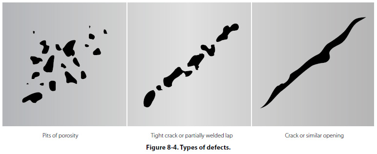 The size of the indication, or accumulation of penetrant, will show the extent of the defect and the brilliance will be a measure of its depth. Deep cracks will hold more penetrant and will be broader and more brilliant. Very fine openings can hold only small amounts of penetrants and will appear as fine lines. Figure 8-4 shows some of the types of defects that can be located using dry penetrant.