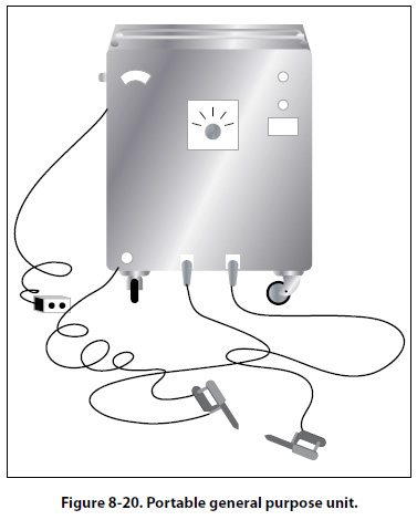 This unit provides direct current for wet continuous or residual magnetization procedures. Circular or longitudinal magnetization may be used and it may be powered with rectified alternating current (ac), as well as direct current (dc). The contact heads provide the electrical terminals for circular magnetization. One head is fixed in position with its contact plate mounted on a shaft surrounded by a pressure spring, so that the plate may be moved longitudinally. The plate is maintained in the extended position by the spring until pressure transmitted through the work from the movable head forces it back. The motor driven movable head slides horizontally in longitudinal guides and is controlled by a switch. The spring allows sufficient overrun of the motor driven head to avoid jamming it and also provides pressure on the ends of the work to ensure good electrical contact. A plunger operated switch in the fixed head cuts out the forward motion circuit of the movable head motor when the spring has been properly compressed. In some units the movable head is hand operated, and the contact plate is sometimes arranged for operation by an air ram. Both contact plates are fitted with various fixtures for supporting the work. The magnetizing circuit is closed by depressing a pushbutton on the front of the unit. It is set to open automatically, usually after about one-half second. The strength of the magnetizing current may be set manually to the desired value by means of the rheostat or increased to the capacity of the unit by the rheostat short circuiting switch. The current utilized is indicated on the ammeter. Longitudinal magnetization is produced by the solenoid, which moves in the same guide rail as the movable head and is connected in the electrical circuit by means of a switch. The suspension liquid is contained in a sump tank and is agitated and circulated by a pump. The suspension is applied to the work through a nozzle. The suspension drains from the work through a nonmetallic grill into a collecting pan that leads back to the sump. The circulating pump is operated by a pushbutton switch. Portable General Purpose Unit It is often necessary to perform the magnetic particle inspection at locations where fixed general purpose equipment is not available or to perform an inspection on members of aircraft structures without removing them from the aircraft. It is particularly useful for inspecting landing gear and engine mounts suspected of having developed cracks in service. Portable units supply both alternating current and direct current magnetization. This unit is only a source of magnetizing and demagnetizing current and does not provide a means for supporting the work or applying the suspension. It operates on 200 volt, 60 cycle, alternating current and contains a rectifier for producing direct current when required. [Figure 8-20]