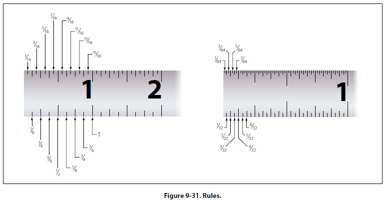 Layout and Measuring Tools Layout and measuring devices are precision tools. They are carefully machined, accurately marked and, in many cases, are made up of very delicate parts. When using these tools, be careful not to drop, bend, or scratch them. The finished product will be no more accurate than the measurements or the layout; therefore, it is very important to understand how to read, use, and care for these tools. Rules Rules are made of steel and are either rigid or flexible. The flexible steel rule will bend, but it should not be bent intentionally as it may be broken rather easily. In aircraft work, the unit of measure most commonly used is the inch. The inch may be divided into smaller parts by means of either common or decimal fraction divisions. The fractional divisions for an inch are found by dividing the inch into equal parts: halves (1/2), quarters (1/4), eighths (1/8), sixteenths (1/16), thirty-seconds (1/32), and sixty-fourths (1/64). The fractions of an inch may be expressed in decimals, called decimal equivalents of an inch; for example, 1/8 inch is expressed as 0.0125 (one hundred twenty-five ten-thousandths of an inch). Rules are manufactured in two basic styles — those divided or marked in common fractions and those divided or marked in decimals or divisions of one onehundredth of an inch. A rule may be used either as a measuring tool or as a straightedge. [Figure 9-31]