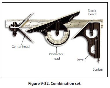 Combination Sets The combination set, as its name implies, is a tool that has several uses. It can be used for the same purposes as an ordinary tri-square, but it differs from the trisquare in that the head slides along the blade and can be clamped at any desired place. Combined with the square or stock head are a level and scriber. The head slides in a central groove on the blade or scale, which can be used separately as a rule. [Figure 9-32]