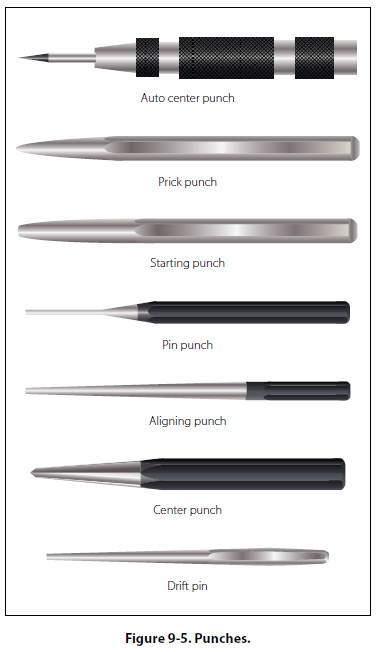 Punches Punches are used to locate centers for drawing circles, to start holes for drilling, to punch holes in sheet metal, to transfer location of holes in patterns, and to remove damaged rivets, pins or bolts. Solid or hollow punches are the two types generally used. Solid punches are classified according to the shape of their points. Figure 9-5 shows several types of punches.
