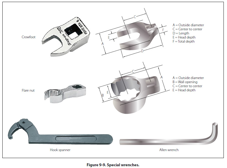 Special Wrenches The category of special wrenches includes the crowfoot, flare nut, spanner, torque, and Allen wrenches. [Figures 9-9 and 9-10]