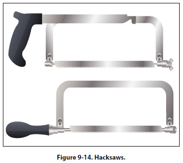 Aviation snips are designed especially for cutting heattreated aluminum alloy and stainless steel. They are also adaptable for enlarging small holes. The blades have small teeth on the cutting edges and are shaped for cutting very small circles and irregular outlines. The handles are the compound leverage type, making it possible to cut material as thick as 0.051 inch. Aviation snips are available in two types, those which cut from right to left and those which cut from left to right. Unlike the hacksaw, snips do not remove any material when the cut is made, but minute fractures often occur along the cut. Therefore, cuts should be made about 1/32 inch from the layout line and finished by hand filing down to the line. Hacksaws The common hacksaw has a blade, a frame, and a handle. The handle can be obtained in two styles: pistol grip and straight. [Figure 9-14]