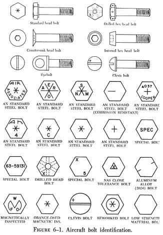 AN bolts come in three head styles - hex head, clevis, and eyebolt (see figure 6-1). NAS bolts are available in hex head, internal wrenching, and countersunk head styles. MS bolts come in hex head and internal wrenching styles.