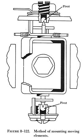 Another type of mounting has been designed in which the pivot points are reversed and the bearings are inside the moving coil assembly. A method of mounting moving elements is shown in figure 8-122. The bearings are highly polished jewels such as sapphires, synthetic jewels, or very hard glass. These are usually round and have a conical depression in which the pivots rotate. They are set in threaded nuts which allow adjustment. The radius of the depression in the jewel is greater than the radius of the pivot point. This limits the area of contact surfaces and provides a bearing which, when operated dry, probably has the lowest constant friction value of any known type of bearing. The case houses the instrument movement and protects it from mechanical injury and exposure. It also has a window for viewing the movement of the pointer across a calibrated scale. The dial has printed on it pertinent information such as the scale, units of measurement, and meter uses. The terminals are made of materials having very low electrical resistance. Their function is to conduct the required current into and away from the meter. |
