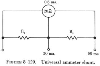Universal Ammeter Shunt The schematic drawing in figure 8-129, the universal shunt, shows an arrangement whereby two or more ranges are provided by tapping the shunt resistor at the proper points. In this arrangement, a 0 - 5 ma. movement with a resistance of 20 ohms is shunted to provide a 0 - 25 ma. range and a 0 - 50 ma. range. |