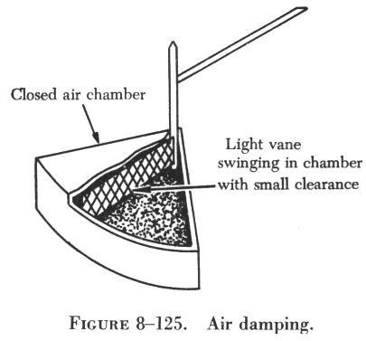 Electrical Damping A common method of damping by electrical means is to wind the moving coil on an aluminum frame. As the coil moves in the field of the permanent magnet, eddy currents are set up in the aluminum frame. The magnetic field produced by the eddy currents opposes the motion of the coil. The pointer will therefore swing more slowly to its proper position and come to rest quickly with very little oscillation. Mechanical Damping Air damping is a common method of damping by mechanical means. As shown in figure 8-125, a vane is attached to the shaft of the moving element and enclosed in an air chamber. The movement of the shaft is retarded because of the resistance which the air offers to the vane. Effective damping is achieved if the vane nearly touches the walls of the chamber. |