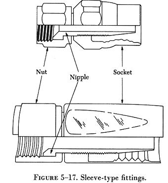 When failure occurs in a flexible hose equipped with swaged end fittings, the entire assembly must be replaced. Obtain a new hose assembly of the correct size and length, complete with factory installed end fittings. When failure occurs in hose equipped with reusable end fittings, a replacement line can be fabricated with the use of such tooling as may be necessary to comply with the assembly instructions of the manufacturer. Assembly of Sleeve-Type Fittings Sleeve-type end fittings for flexible hose are detachable and may be reused if determined to be serviceable. The inside diameter of the fitting is the same as the inside diameter of the hose to which it is attached. Common sleeve-type fittings are shown in figure 5-17. |