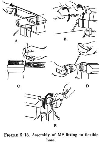 Installation of Flexible Hose Assemblies Flexible hose must not be twisted on installation, since this reduces the life of the hose considerably and may also loosen the fittings. Twisting of the hose can be determined from the identification stripe running along its length. This stripe should not spiral around the hose. Flexible hose should be protected from chafing by wrapping it with tape, but only where necessary. The minimum bend radius for flexible hose varies according to size and construction of the hose and the pressure under which the hose is to operate. Bends that are too sharp will reduce the bursting pressure of flexible hose considerably below its rated value (figure 5-19). |