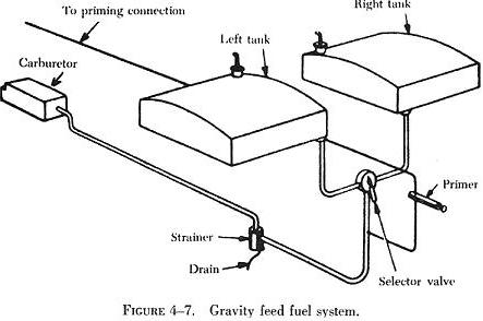 The simplest type of fuel system is the gravity feed, which is still in use on many low powered airplanes. A gravity feed system is shown in figure 4-7. The fuel tanks are mounted above the carburetor, with gravity causing the fuel to flow from the tanks to the carburetor. A selector valve is provided to stop the fuel flow or to select a particular tank in the system from which to draw fuel. A strainer filters the fuel before it reaches the carburetor. A drain is provided for removing water and sediment trapped at the strainer. A primer furnishes the additional fuel required for engine starting.
