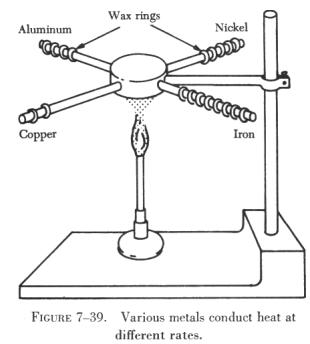 Figure 7-39 illustrates the different rates of conduction of various metals. Four rods of different metals have several wax rings handing on them. One flame is used to heat one end of each rod simultaneously. The rings melt and drop off the copper rod first, then from the aluminum rod, then from the nickel rod, and last from the iron rod. This example shows that among the four metals used, copper is the best conductor of heat and iron is the poorest.