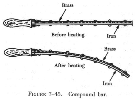 A practical application which uses the difference in the coefficients of linear expansion of metals is the thermostat. This instrument consists of an arrangement of two bars of dissimilar metal fastened together. When the temperature changes, a bending takes place because of the unequal expansion of the metals. Figure 7-45 shows such an instrument, made with a wooden handle for laboratory demonstrations. Thermostats are used in overload relays in motors, in temperature sensitive switches, and in heating systems.