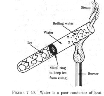 Liquids are poorer conductors of heat than metals. Notice that the ice in the test tube shown in figure 7-40 is not melting rapidly even though the water at the top is boiling. The water conducts heat so poorly that not enough heat reaches the ice to melt it.
