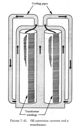 A convection process may take place in a liquid as well as in a gas. Figure 7-41 shows a transformer in an oil bath. The hot oil is less dense (has less weight per unit volume) and rises, while the cool oil falls, is heated, and rises in turn.
