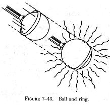 Solid materials expand in length, width, and thickness when they are heated. An example of the expansion and contraction of substances is the ball and ring, illustrated in figure 7-43. The ball and ring are made of iron. When both are at the same temperature, the ball will barely slip through the ring. When the ball is heated or the ring is cooled, however, the ball cannot slip through the ring.