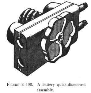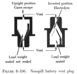 The other is the exhaust vent tube and is attached to the battery drain sump, which is a glass jar containing a felt pad moistened with a concentrated solution of sodium bicarbonate (baking soda). With this arrangement, the airstream is directed through the battery case where battery gases are picked up, neutralized in the sump, and then expelled overboard without damage to the airplane.