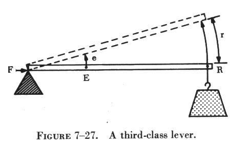 The human arm (figure 7-28) is a third class lever. It is this lever action that makes possible the quick flexing of the arms. Note that the elbow is the fulcrum. The biceps muscle, which is tied onto the forearm below the elbow, applies the effort; and the hand, is the resistance. Third class levers should be used to gain speed, rather than to move heavy loads.
