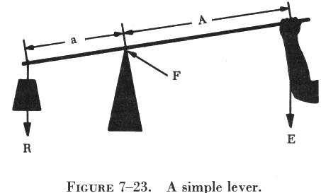 There are three basic parts in all levers; namely, the fulcrum "F," a force or effort "E," and a resistance "R." Shown in figure 7-23 are the pivotal point "F" (fulcrum); the effort "E," which is applied at a distance "A" from the fulcrum; and a resistance "R," which acts at a distance "a" from the fulcrum. Distances "A" and "a" are the lever arms.