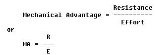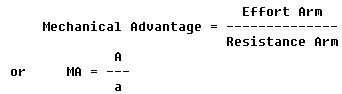 Mechanical advantage of levers may also be found by dividing the length of the effort arm "A" by the length of the resistance arm "a." Stated as a formula, this reads: