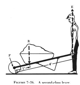 The second class lever (B of figure 7-24) has the fulcrum at one end; the effort is applied at the other end. The resistance is somewhere between these points. The wheelbarrow in figure 7-26 is a good example of a second class lever.
