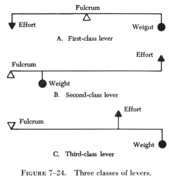 The three classes of levers are illustrated in figure 7-24. The location of the fulcrum (the fixed or pivot point) with relation to the resistance (or weight) and the effort determines the lever class.