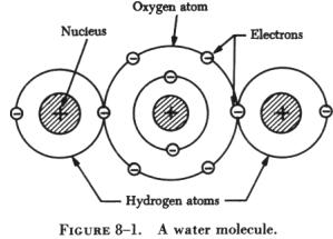 Substances composed of only one type of atom are called elements. But most substances occur in nature as compounds, that is, combinations of two or more types of atoms. Water, for example is a compound of two atoms of hydrogen and one atom of oxygen. A molecule of water is illustrated in figure 8-1. It would no longer retain the characteristics of water if it was compounded of one atom of hydrogen and two atoms of oxygen.
