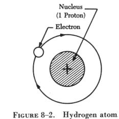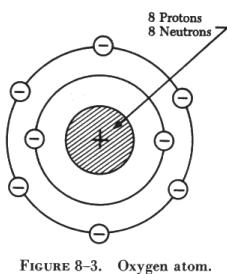 The simplest atom is that of hydrogen, which is one electron orbiting around one proton, as shown in figure 8-2. A more complex atom is that of oxygen (see figure 8-3), which consists of eight electrons rotating in two different orbits around a nucleus made up of eight protons and eight neutrons.