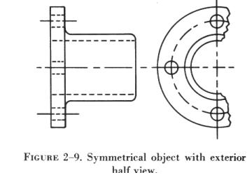 When space is limited and two views must be shown, symmetrical objects are often represented by half views, as illustrated in figure 2-9. Aircraft drawings seldom show more than two principal, or complete, views of an object. Instead, generally there will be one complete view and one or more detail views or sectional views. |