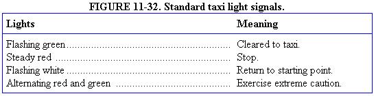 As a general rule, only rated pilots and qualified airframe and powerplant technicians are authorized to start, run up, and taxi aircraft. All taxiing operations should be performed in accordance with applicable local regulations. Figure 11-32 contains the standard taxi light signals used by control towers to control and expedite the taxiing of aircraft. Refer to the following section, "Taxi Signals," for detailed instructions on taxi signals and related taxi instructions.