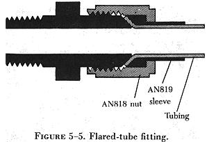 A flared tube fitting consists of a sleeve and a nut, as shown in figure 5-5. The nut fits over the sleeve and, when tightened, draws the sleeve and tubing flare tightly against a male fitting to form a seal. Tubing used with this type of fitting must be flared before installation.