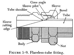 The MS (Military Standard) flareless tube fittings are finding wide application in aircraft plumbing systems. Using this type fitting eliminates all tube flaring, yet provides a safe, strong, dependable tube connection. The fitting consists of three parts: a body, a sleeve, and a nut. The body has a counterbored shoulder, against which the end of the tube rests. (See figure 5-9.) The angle of the counterbore causes the cutting edge of the sleeve to cut into the outside of the tube when the two are joined. Installation of flareless tube fittings is discussed later in this chapter.